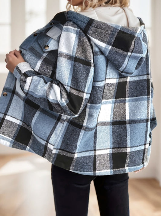 Women's Plaid Hooded Jacket - Casual Long Sleeve Shacket With Button Front